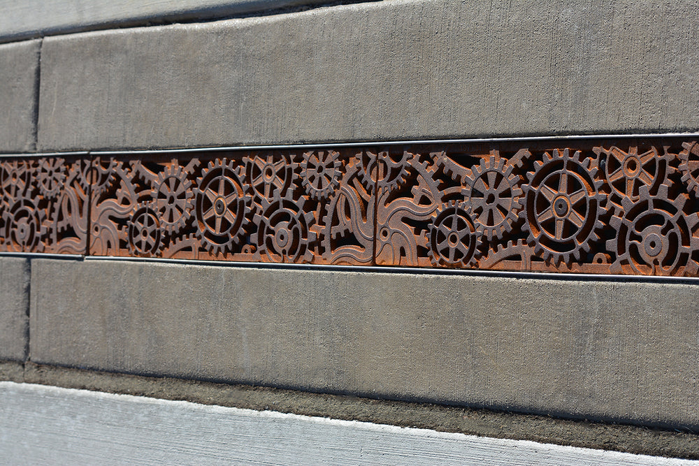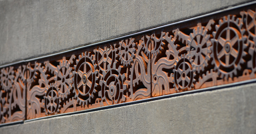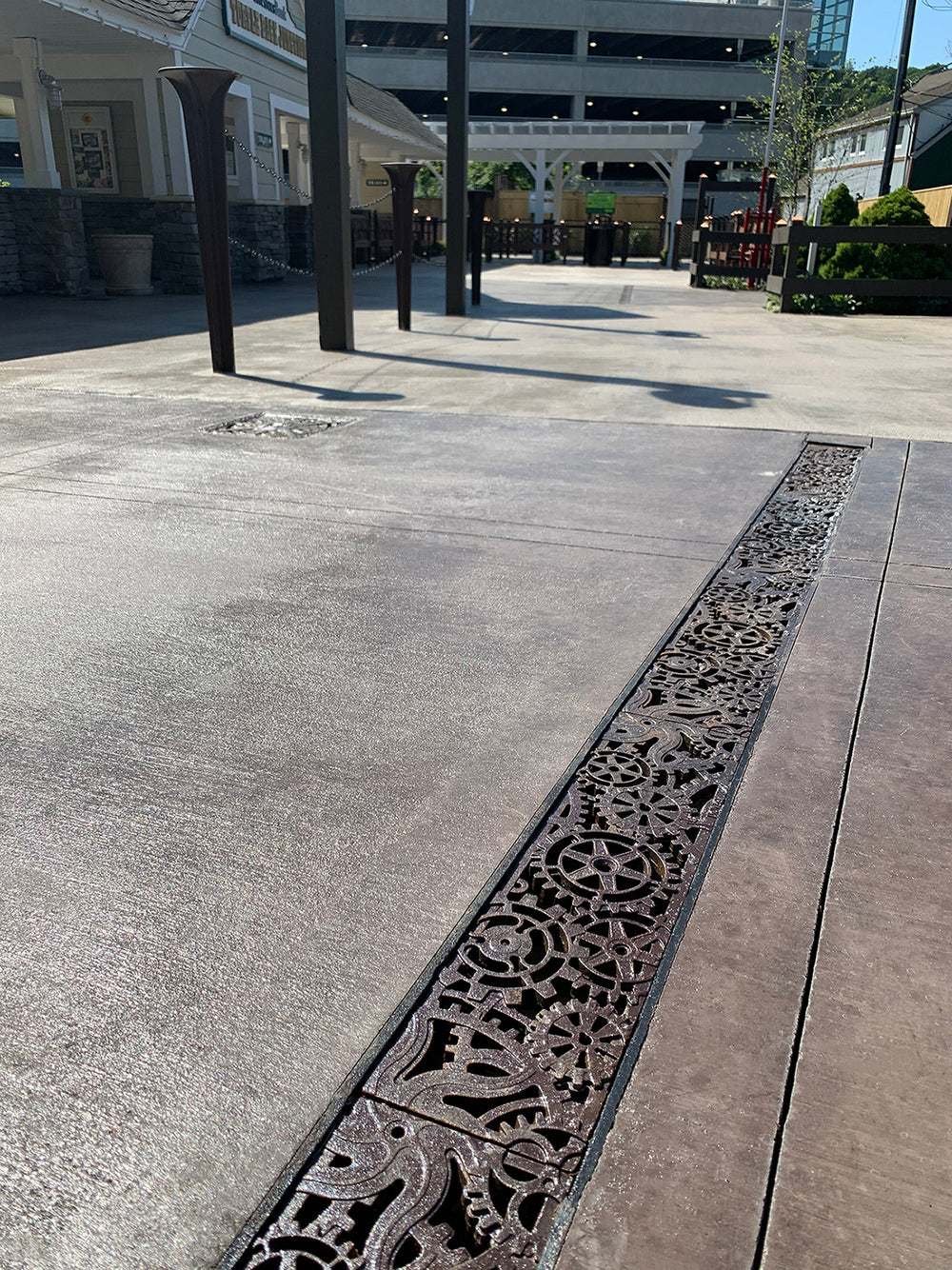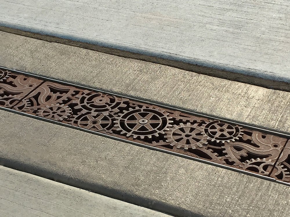The lively, interlocking gear design of our Dynamo Trench Grate adds an energizing element to any hardscape environment.